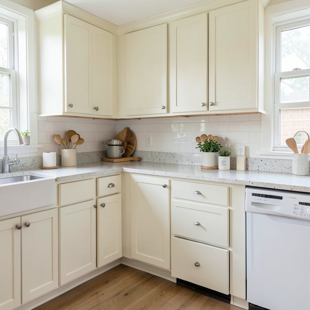 This color looks lovely with brass pulls, white dishes, and woven baskets. It also hides small marks better than very pale colors, which is helpful in busy kitchens.