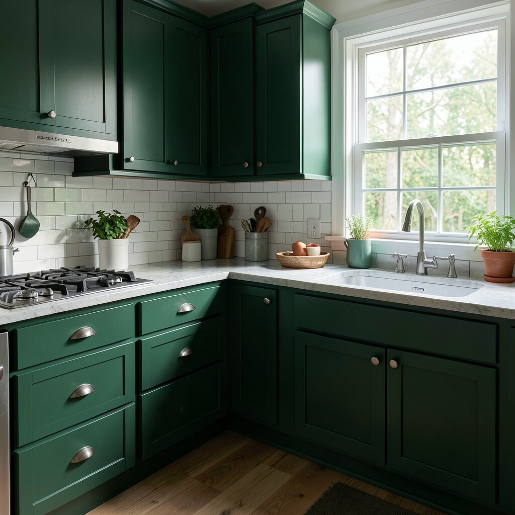 Forest green brings a deep, cozy feeling to the kitchen. It can make the room feel like a warm cabin with a stylish edge.
