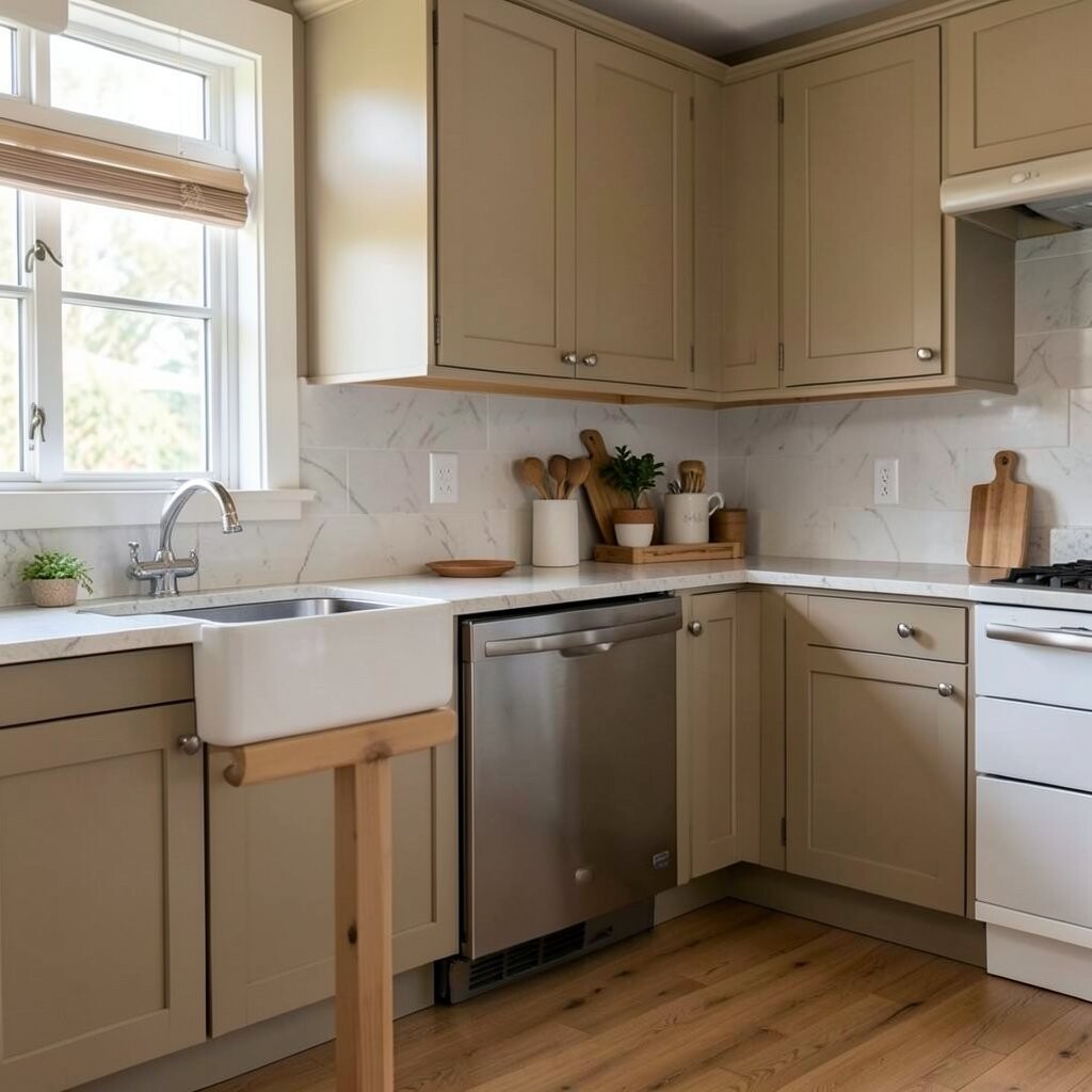 Warm taupe is a soft mix of beige and gray. It gives the kitchen a calm, cozy look that feels easy on the eyes.
