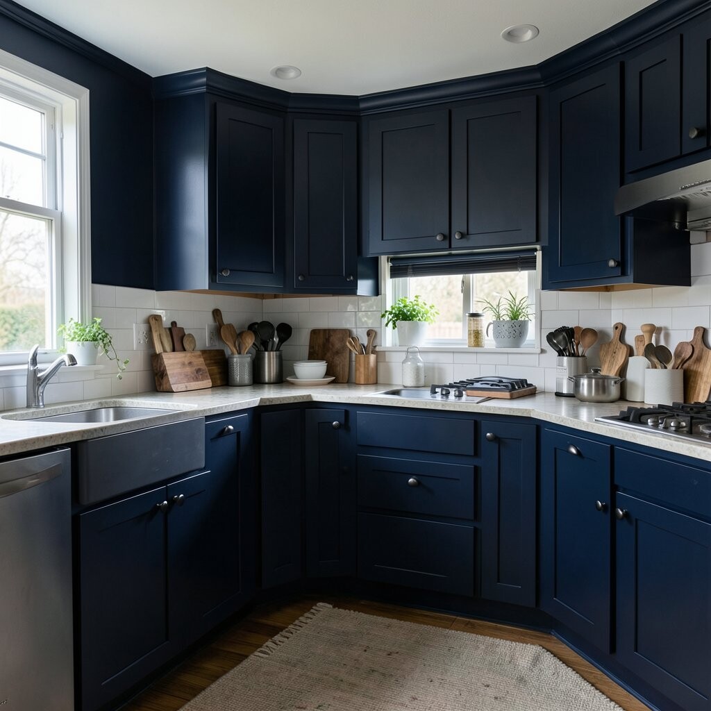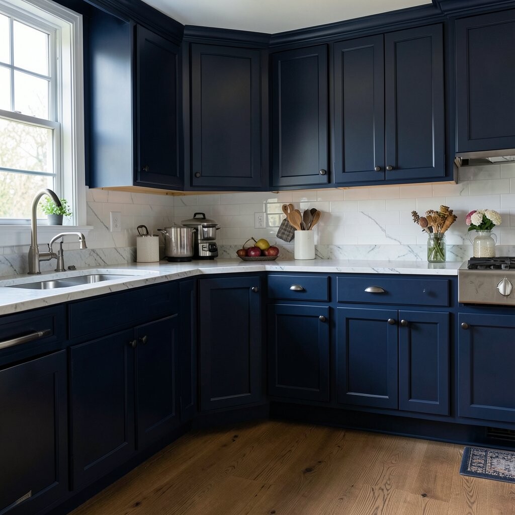 Deep navy gives a kitchen a rich and polished feel. It can make plain cabinets look much more expensive right away.