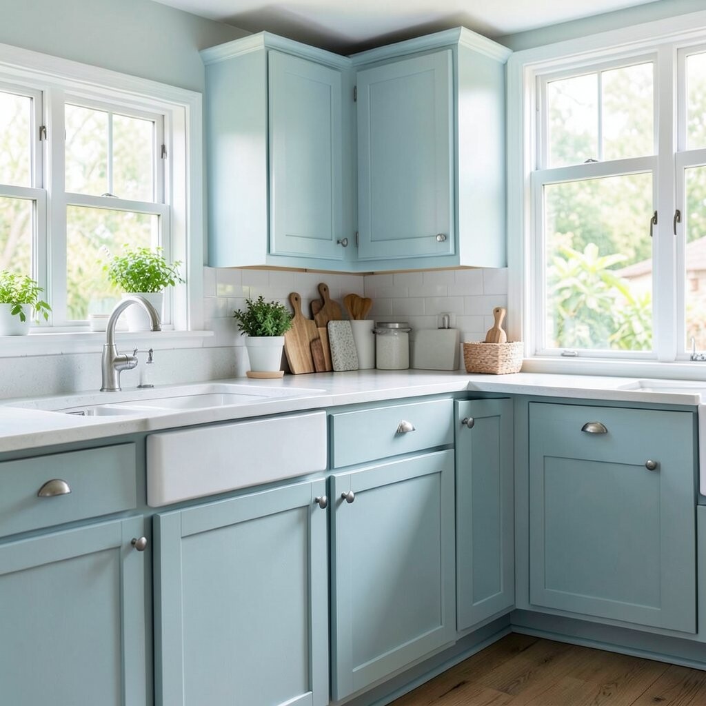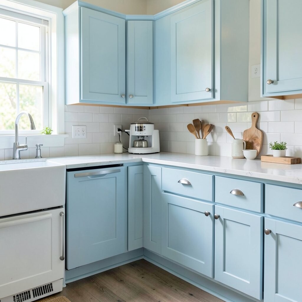 Powder blue feels soft, airy, and clean. It can make a kitchen seem brighter and more open right away.