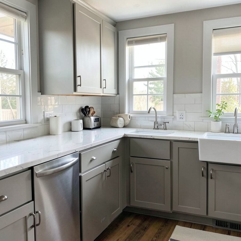 This shade works with many cabinet colors, from white to dark wood. It is a smart choice if you want a calm kitchen that still feels updated.