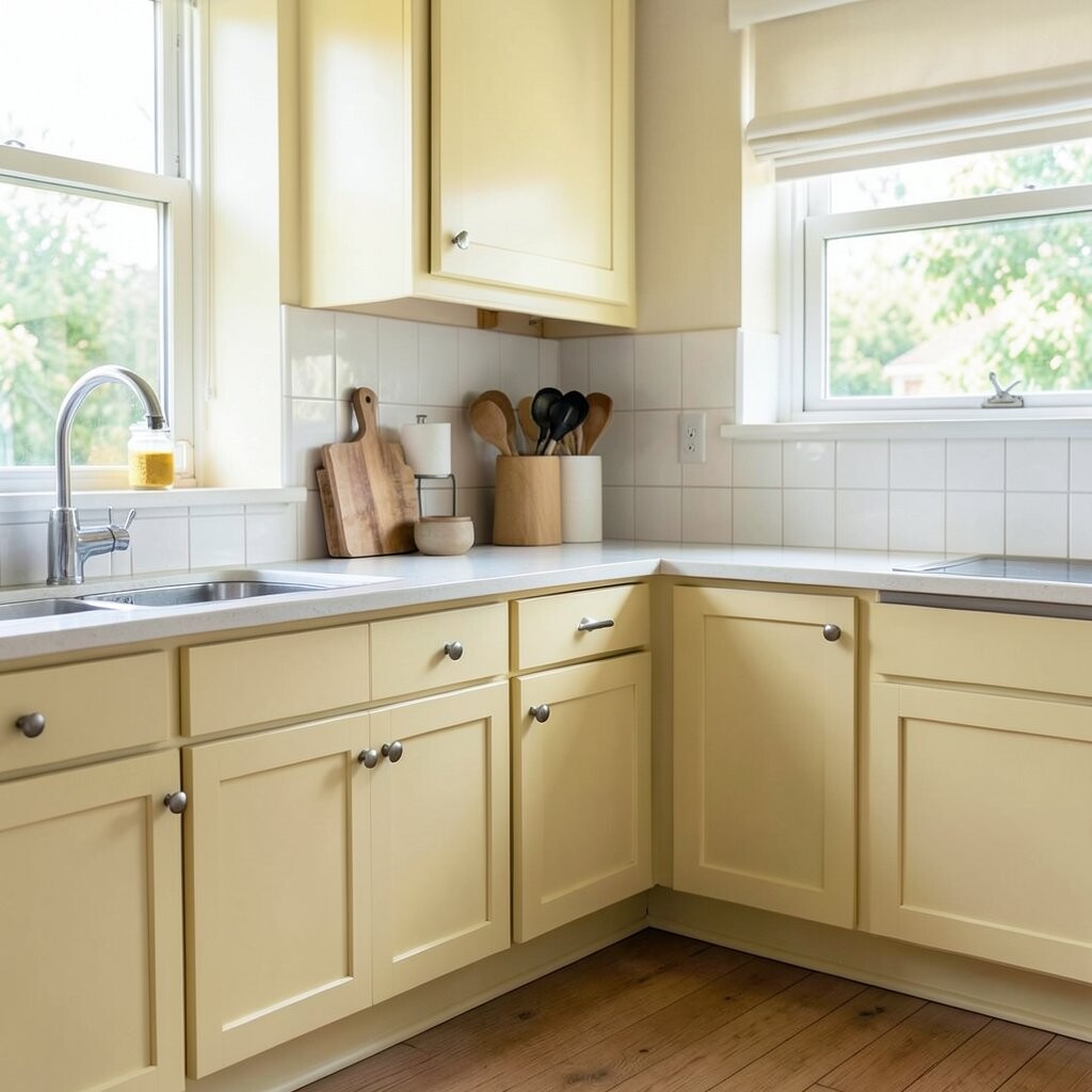 Butter yellow brings a sunny, cheerful feeling into the kitchen. It makes the room feel warm and friendly, like a smile on the walls.