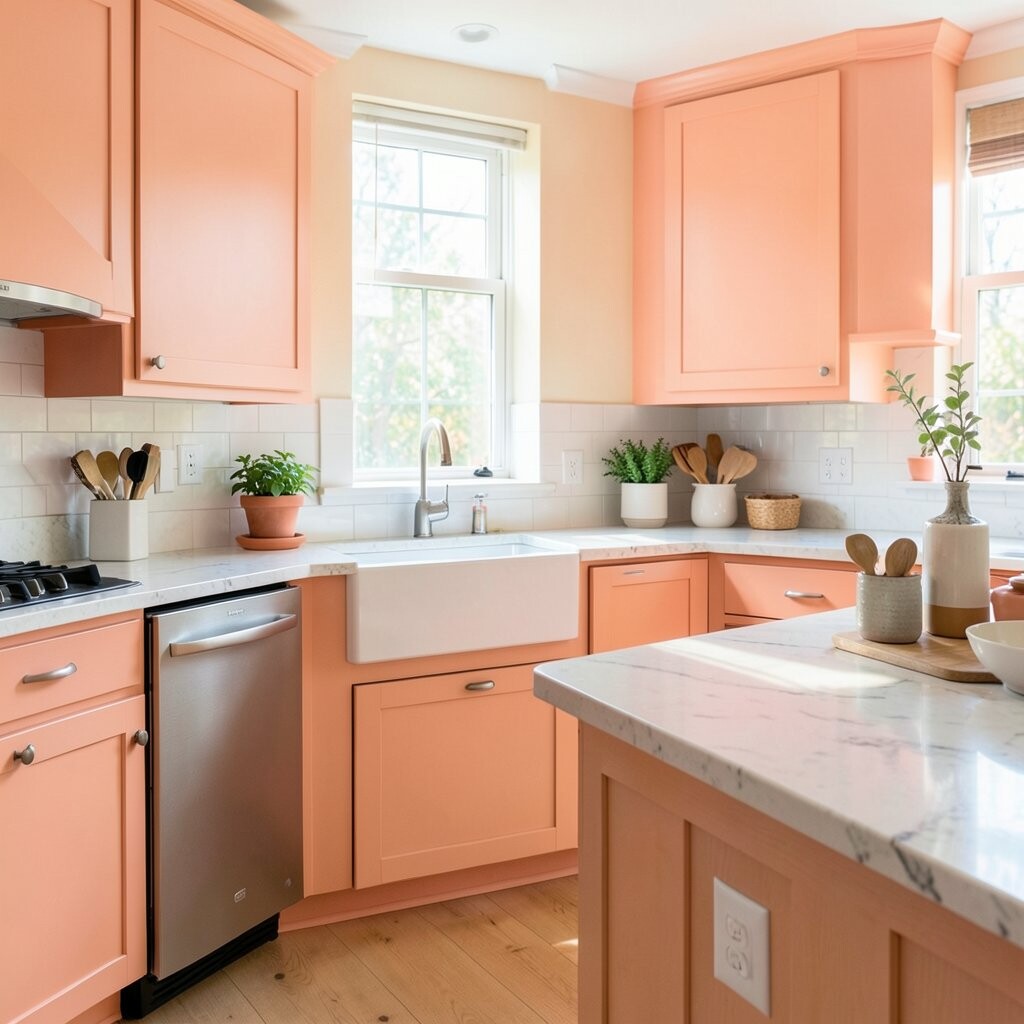Soft peach gives a kitchen a warm glow that feels friendly and light. It can make morning coffee moments feel even happier.