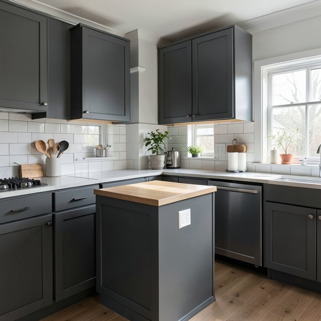 If you want a stylish update on a budget, use charcoal on one feature wall or the island. It gives a bold look while keeping the cost much lower than new cabinets.