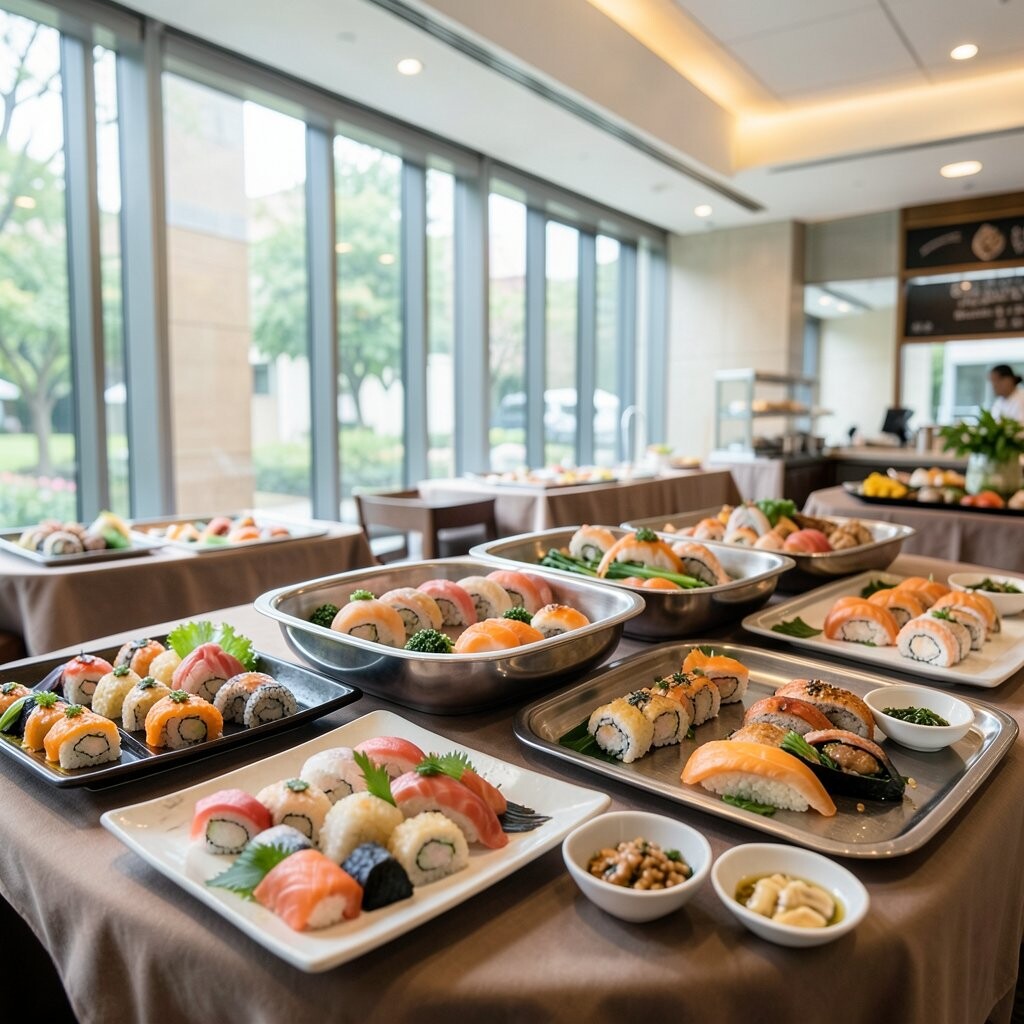 A sushi buffet brings elegance and flair. Think of rolls, sashimi, and nigiri, all beautifully presented. This idea is perfect for adding a touch of sophistication.