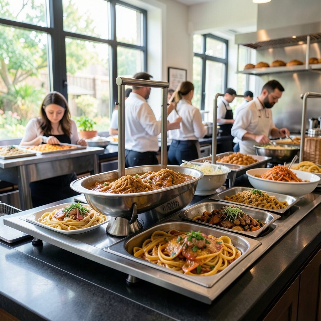 Guests choose their pasta, sauces, and toppings for a custom meal. From marinara to alfredo, the options are endless. It’s interactive and caters to diverse tastes.