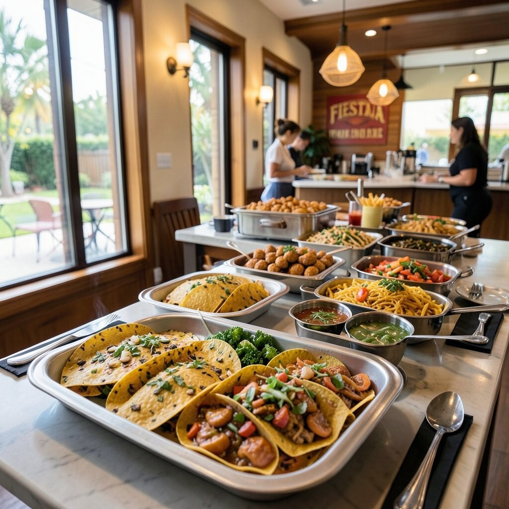 A taco buffet is vibrant and fun. Guests pile on meats, beans, veggies, and salsas to their liking. The setup invites creativity and conversation.