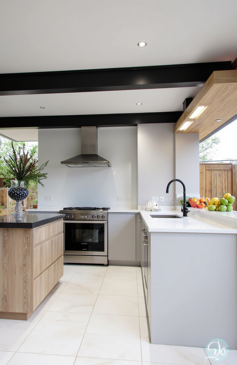 Blend rustic charm with modern amenities in a farmhouse deck kitchen. Whitewashed wood and vintage-inspired fixtures create a cozy setting.