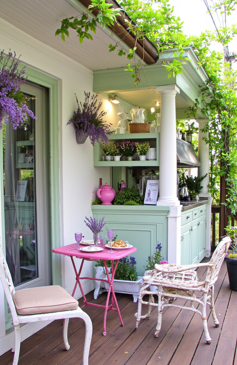 Imagine a deck kitchen with lavender pots and rustic furniture. The French countryside style is charming and graceful.