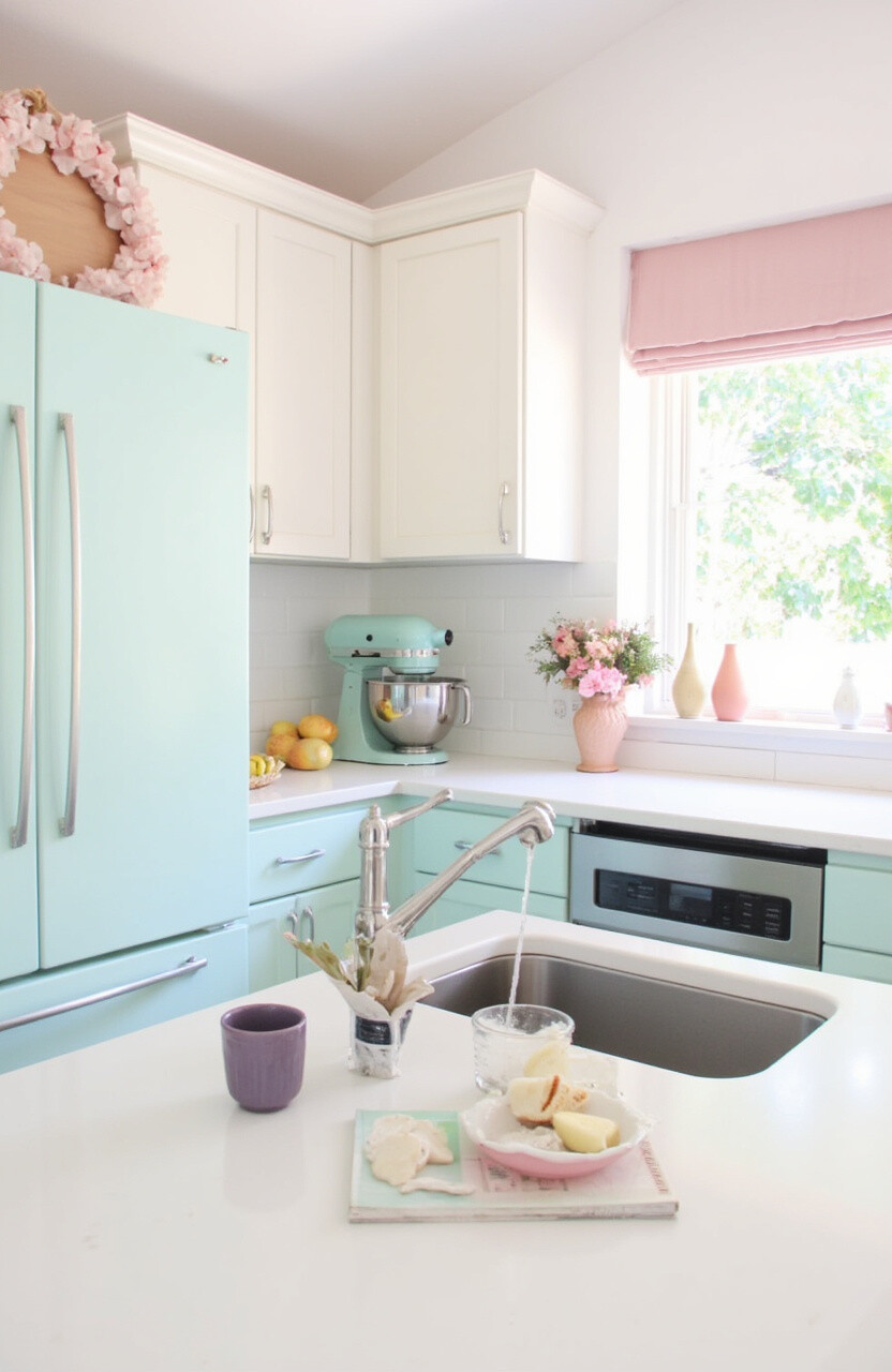 These colors pop beautifully against matte finishes, and you can incorporate them through accessories like vases, dishware, or even a pastel-colored mixer.