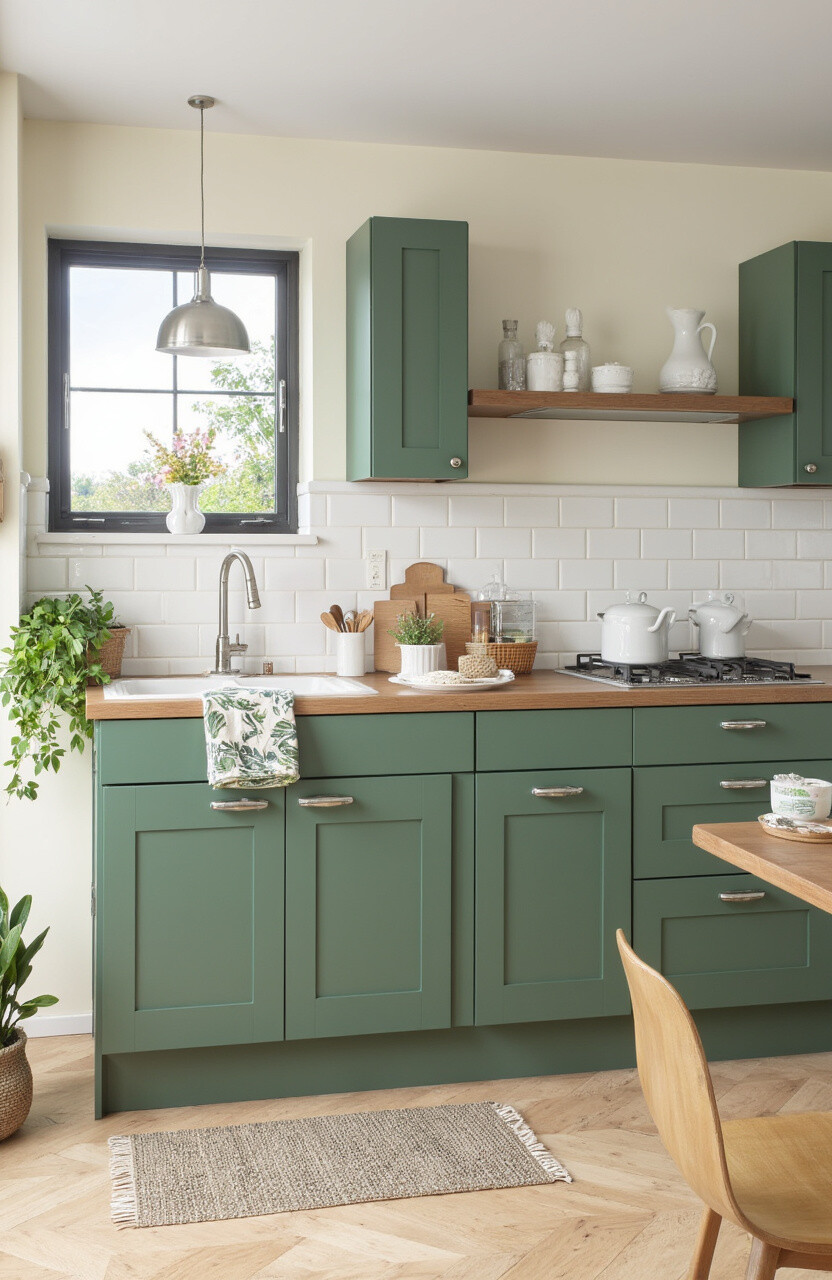 Matte earthy green cabinets can give your kitchen a fresh, natural vibe. It’s like inviting a bit of nature inside.