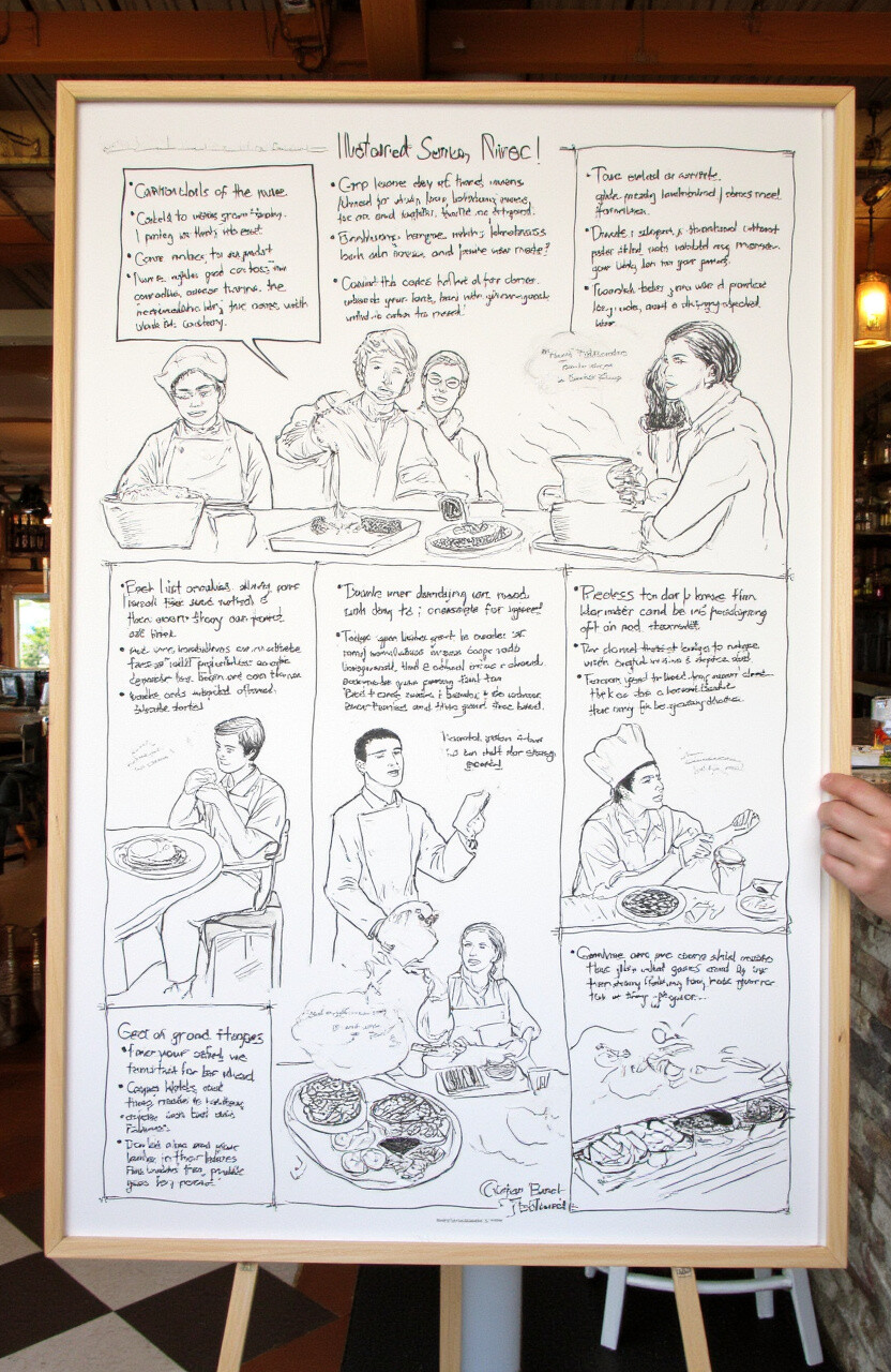 Turn your menu into a story with illustrated storyboards. Each section of the board can tell a part of your restaurant’s story, with drawings of the chefs, the farm where ingredients are sourced, or a day in the life of your café.