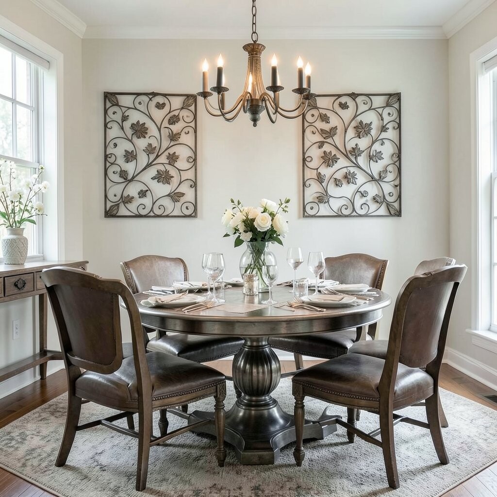 Iron wall art can create a focal point in your dining room. Its sturdy design adds depth and interest to your walls.