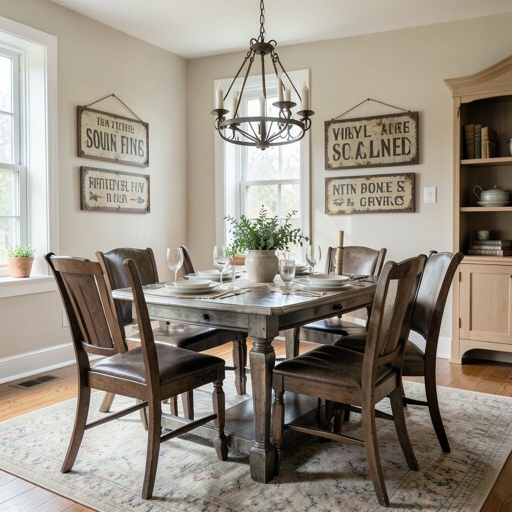 Hang them on your dining room walls for a playful touch. Look for signs with interesting graphics or sayings.