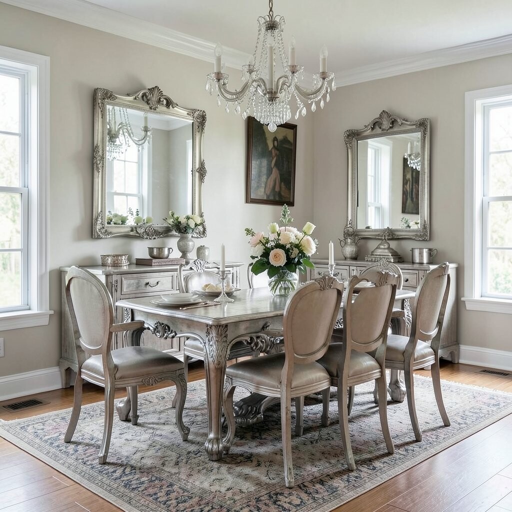 A silver mirror frame can make your dining room look bigger and brighter. It reflects light beautifully and adds a touch of elegance.