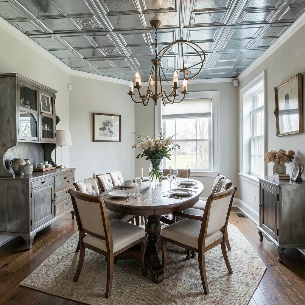 Tin ceiling tiles add texture and interest to your ceiling. They have a vintage charm that’s hard to resist.