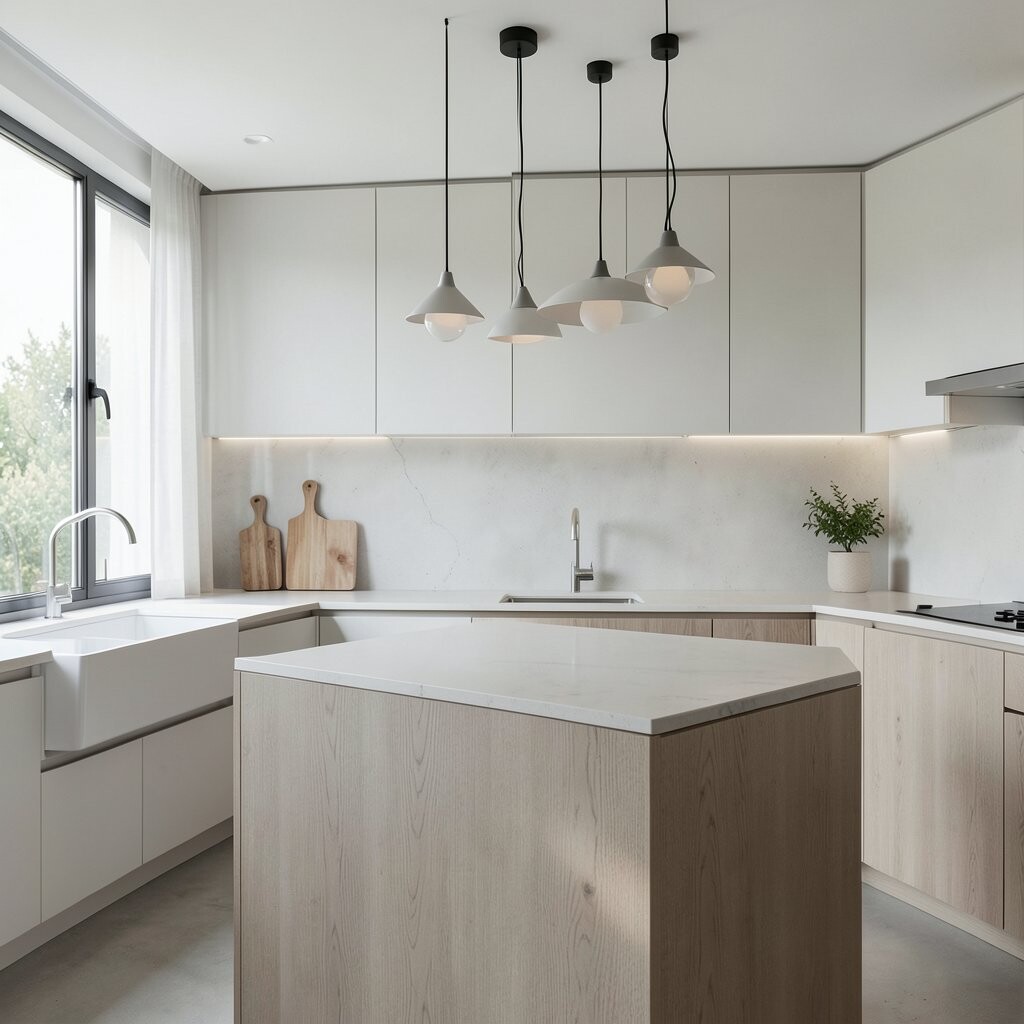 Simple, geometric lighting fixtures can transform the ambiance of your kitchen. Think pendant lights with clean lines or simple Edison bulbs.