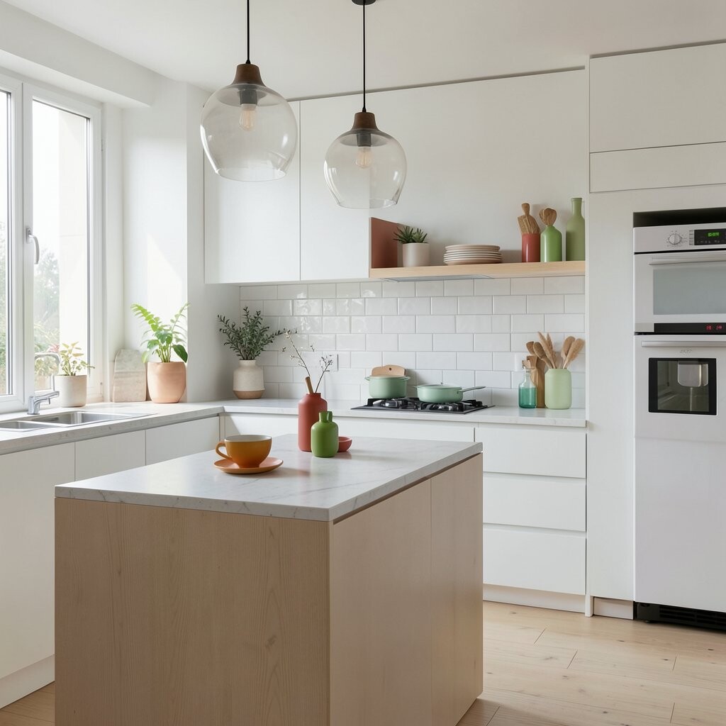 While a minimalist kitchen often relies on neutral tones, a few colorful accents can add interest. Think a bright kettle, a patterned dish towel, or a unique vase.