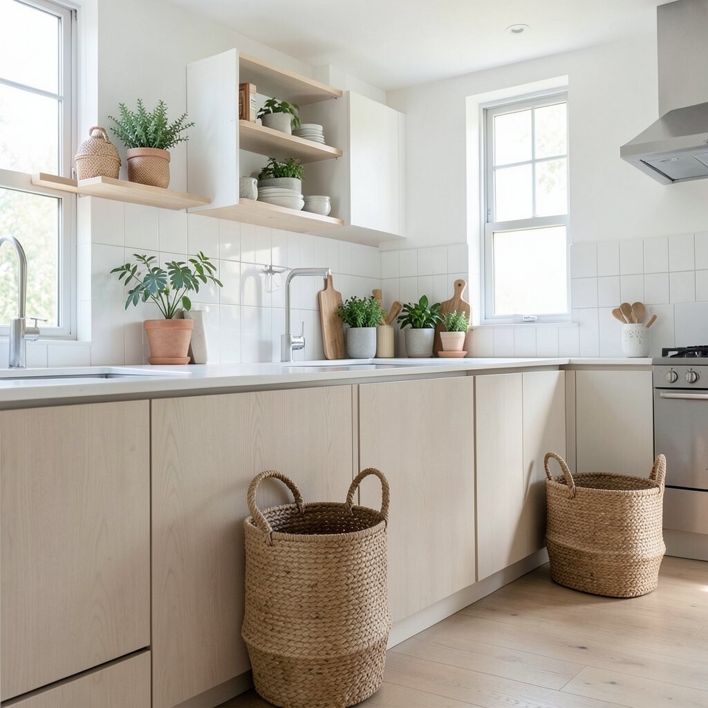 Using baskets for storage adds texture and warmth to a minimalist kitchen. They’re perfect for holding fruits, vegetables, or kitchen linens.
