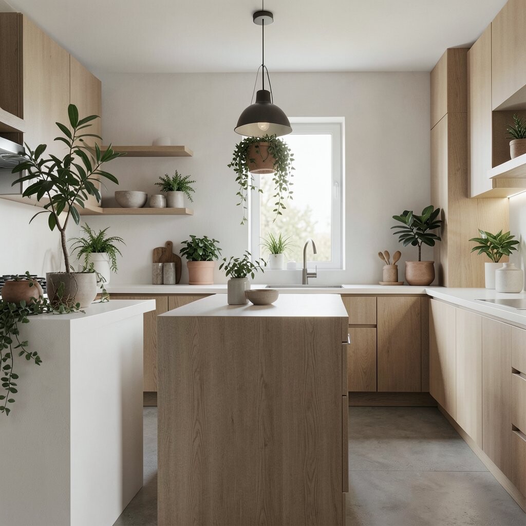 Greenery adds a natural element to your minimalist kitchen. It’s a budget-friendly way to enhance the space and improve air quality.