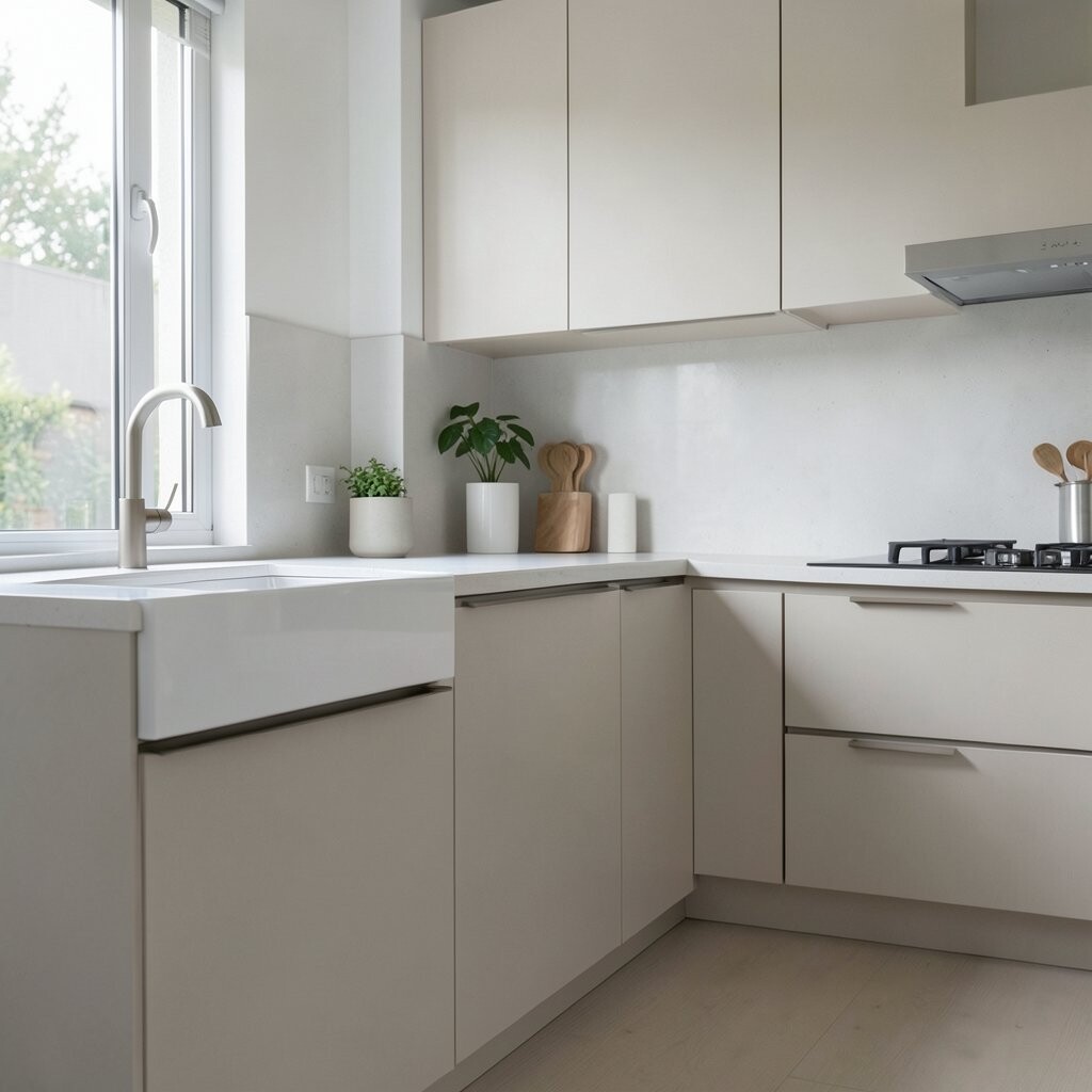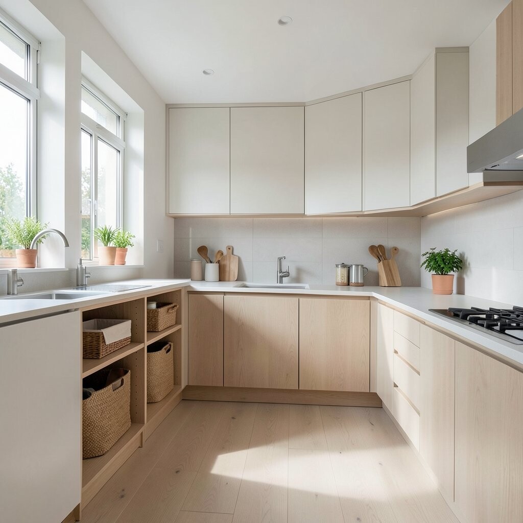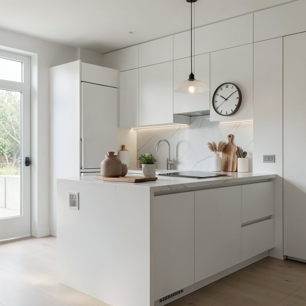 Clever storage solutions help maintain a minimalist look by keeping countertops clear. Think pull-out drawers, corner cabinets, or built-in organizers.