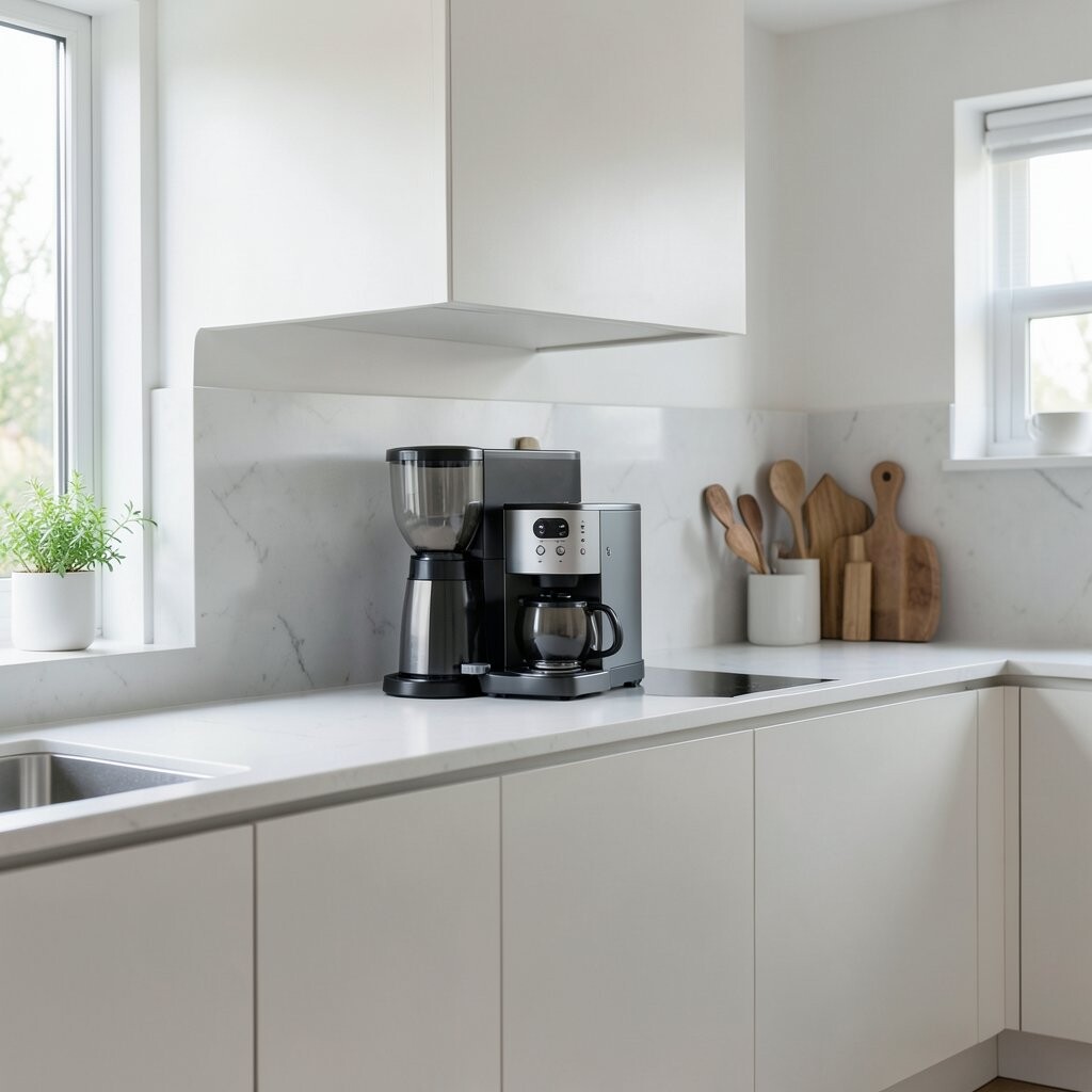 A small, dedicated area for your coffee essentials can make your morning routine more enjoyable. Keep it simple with a coffee maker, mugs, and a few accessories.