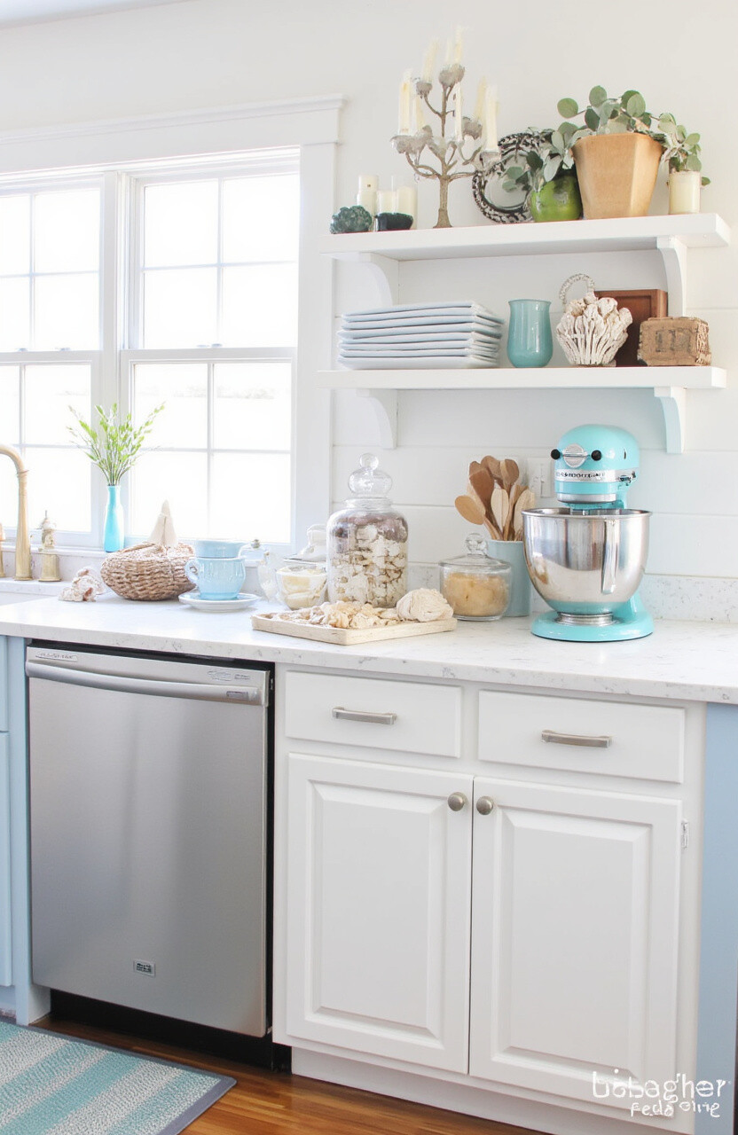 Bring the beach to your kitchen with a coastal-themed mixer station. Think light blues, sandy tones, and nautical accents.