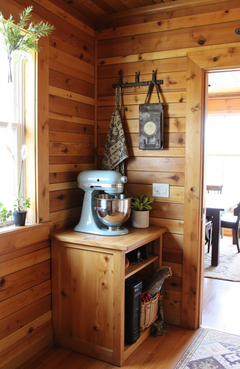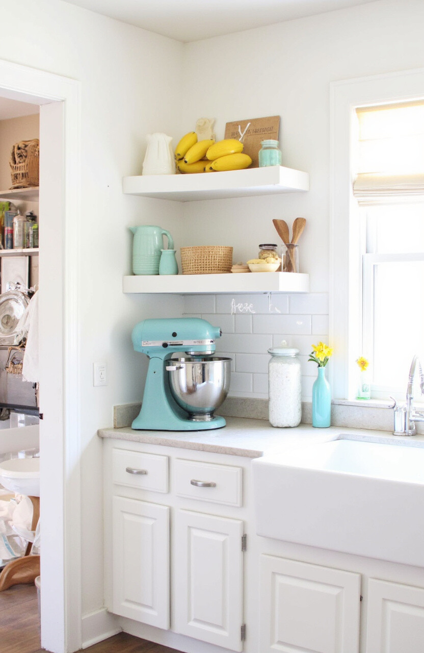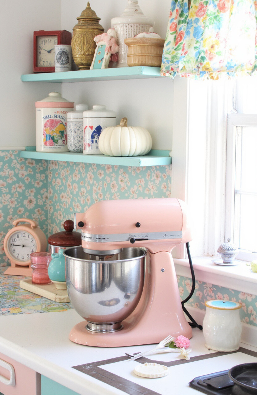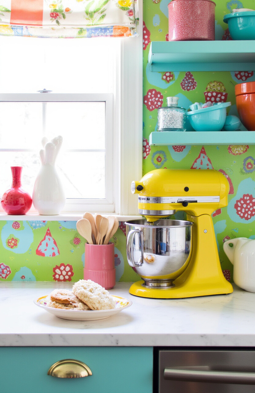 Why not let your mixer station be a burst of color? Use bright paint or a funky wallpaper backdrop. This spot becomes a joyful focal point that energizes the entire kitchen.
