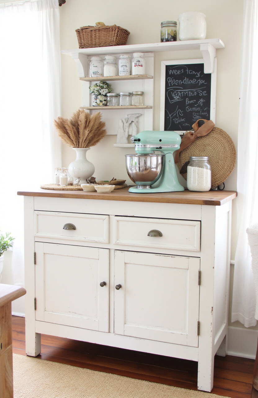 Bring the calm and comfort of the countryside into your kitchen. A farmhouse-style mixer station features distressed wood, vintage finds, and soft pastel colors.