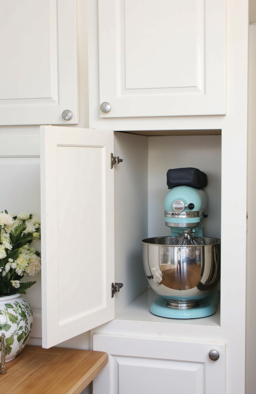 Keep your kitchen looking neat with a hidden mixer station. An appliance garage allows you to tuck away your mixer when it’s not in use. It’s like a secret baking headquarters!