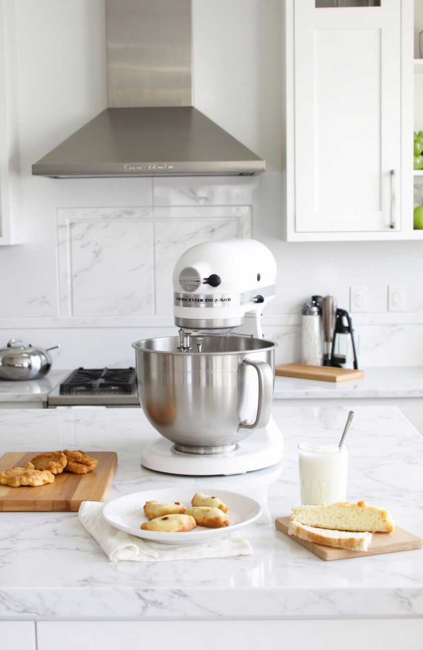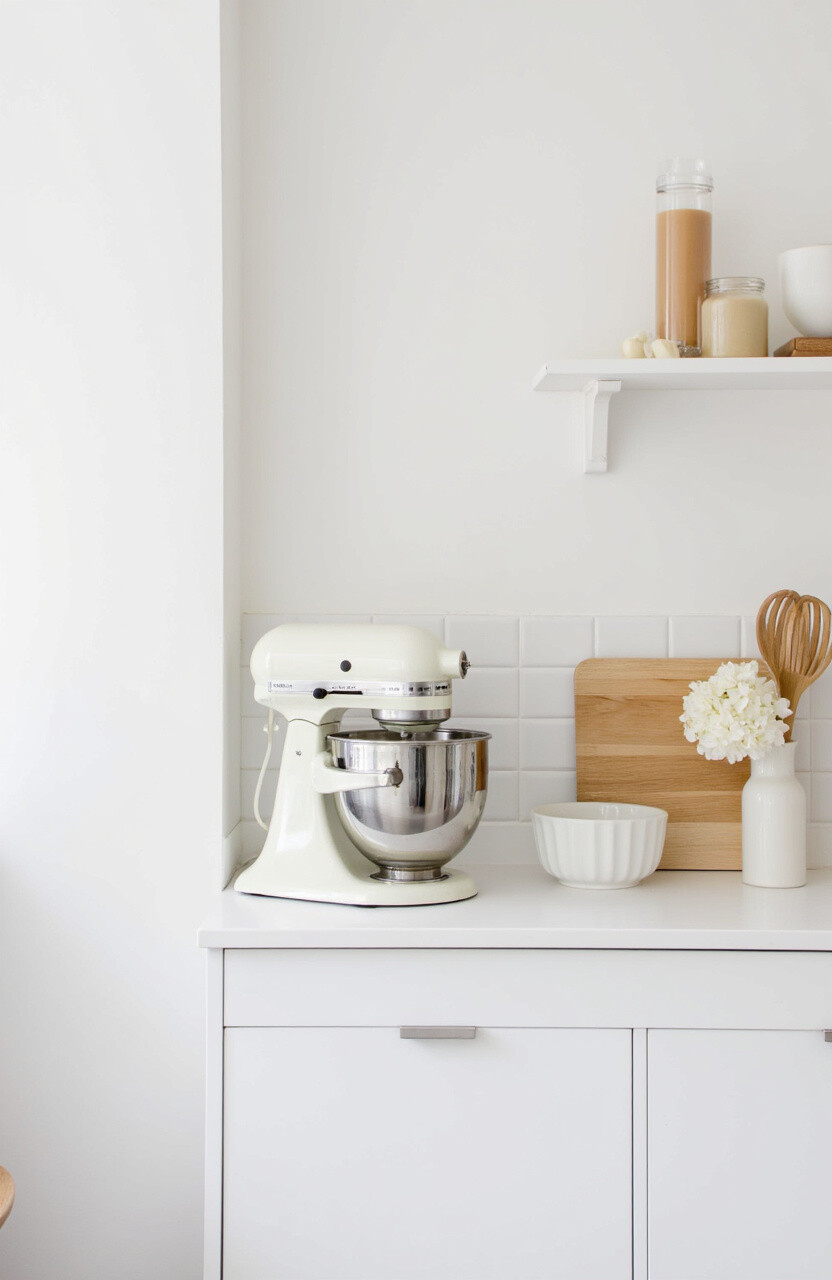 Choose a sleek mixer and keep accessories to a minimum. It’s a calming, modern look that’s budget-friendly and easy to maintain. Your kitchen becomes a serene baking retreat.