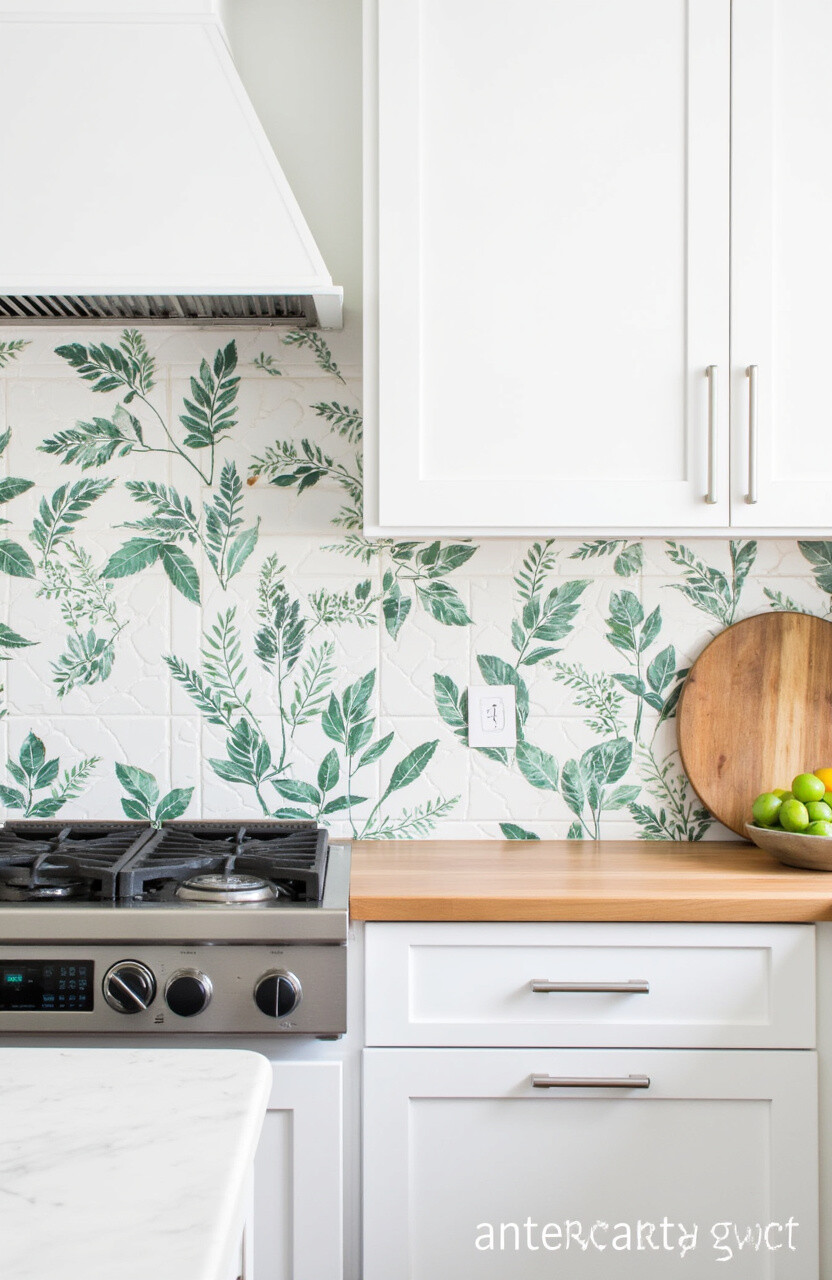 Bring the outside in with a botanical print backsplash. These designs can range from subtle leaf patterns to bold floral prints.