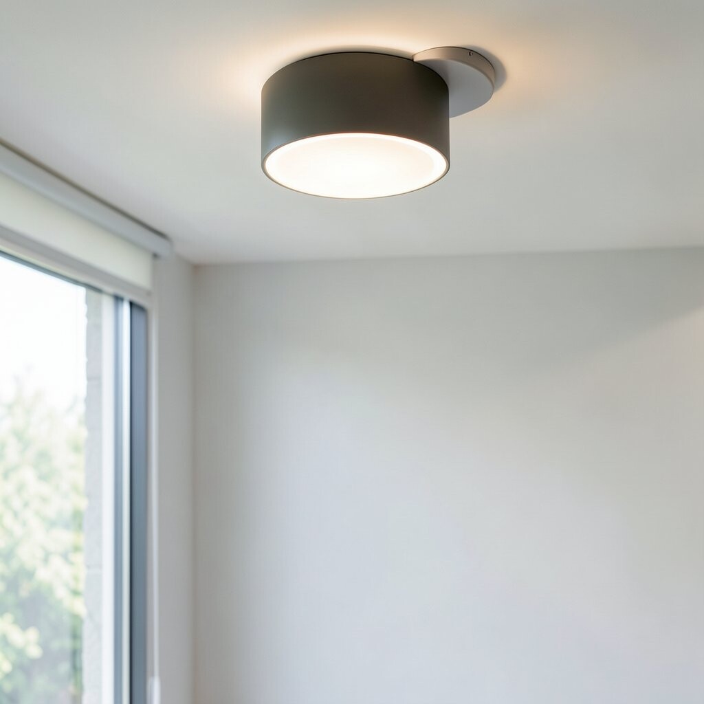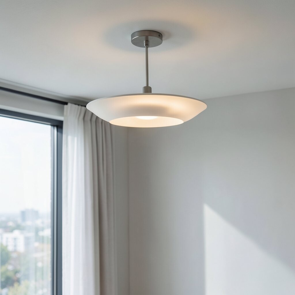 A frosted glass saucer lamp gives off a smooth, soft glow. Its round, low shape feels calm and neat, almost like a floating moon on the ceiling.