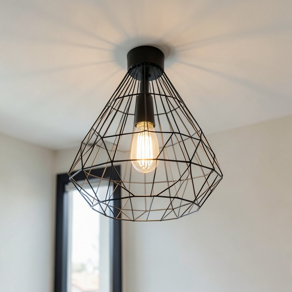 A geometric wireframe lamp looks sharp, open, and very cool. The thin metal lines form shapes like cubes, diamonds, or stars, giving the ceiling a light and airy feel.