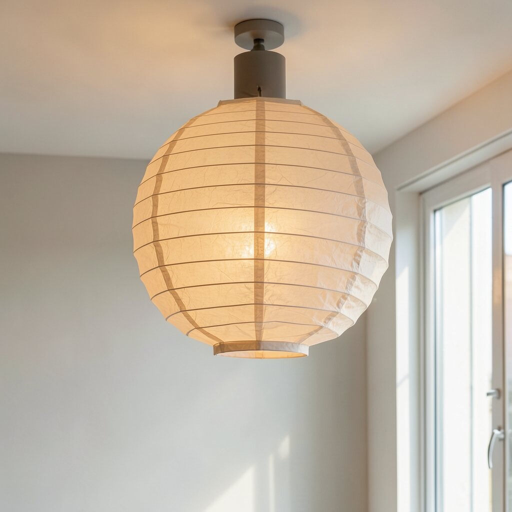 An oversized paper lantern lamp feels soft, light, and very easy to love. It fills the ceiling area with a big round shape that looks calm and friendly.