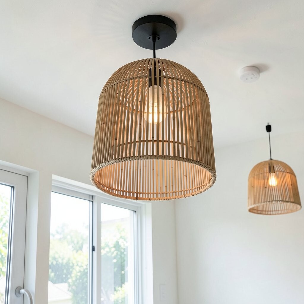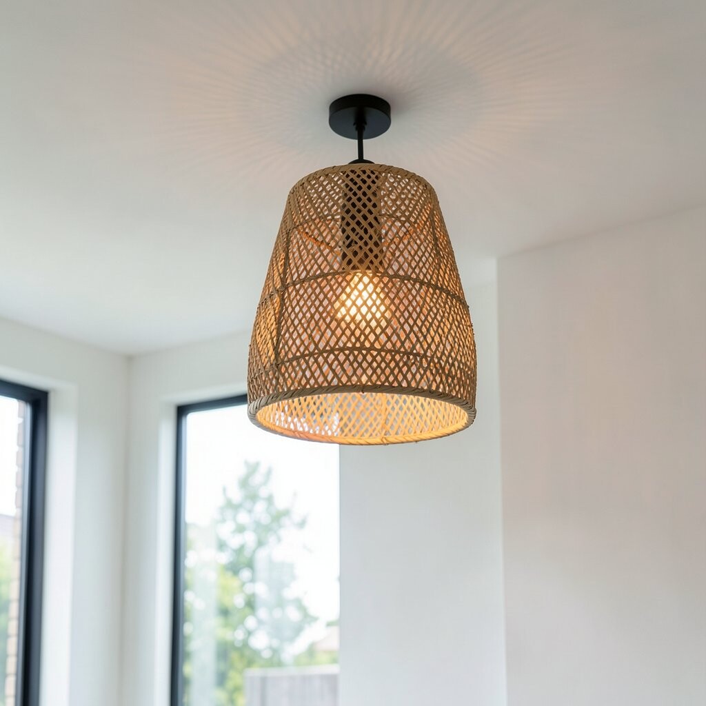 A rattan drum lamp adds a warm, natural touch to a room. The woven shade makes pretty shadow patterns on the walls and ceiling, which feels calm and cozy.