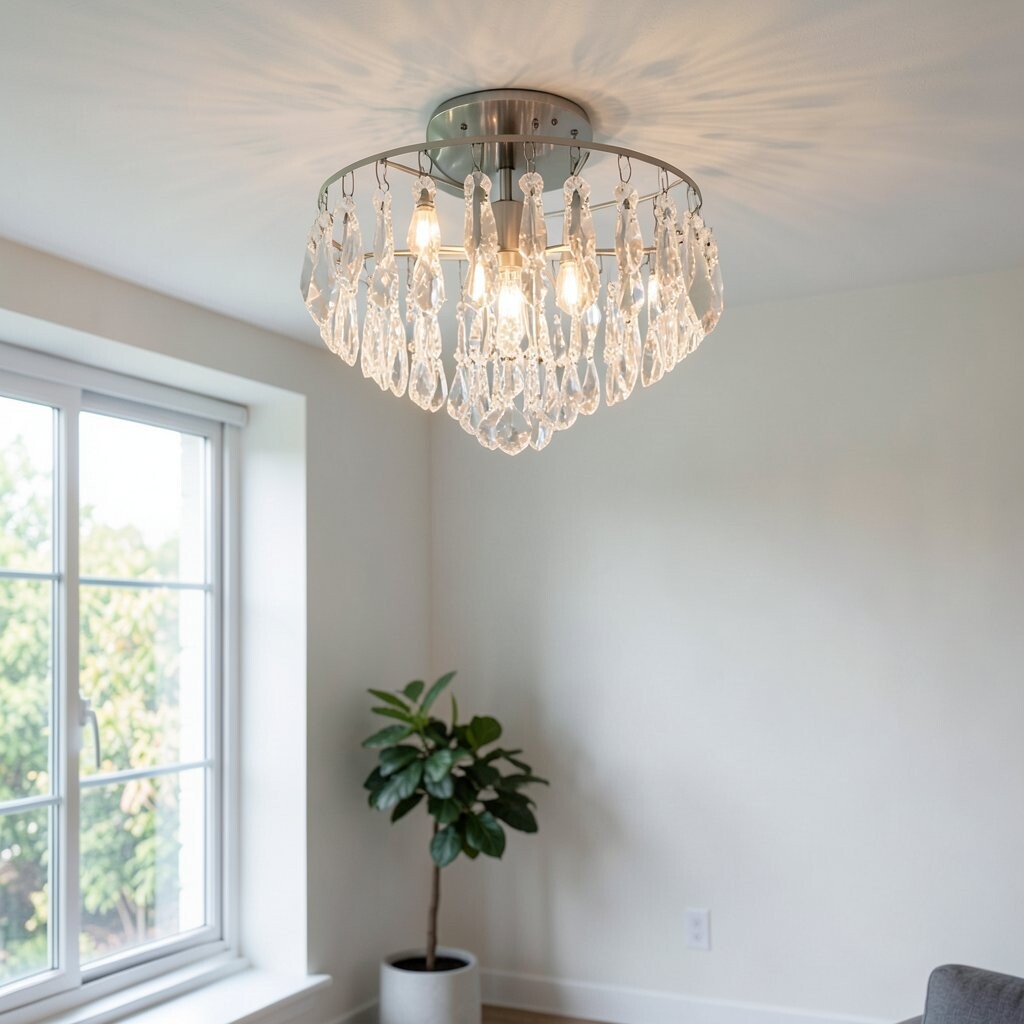 A crystal drop lamp adds sparkle in a soft, modern way. The little hanging pieces catch the light and make the room feel bright and special.