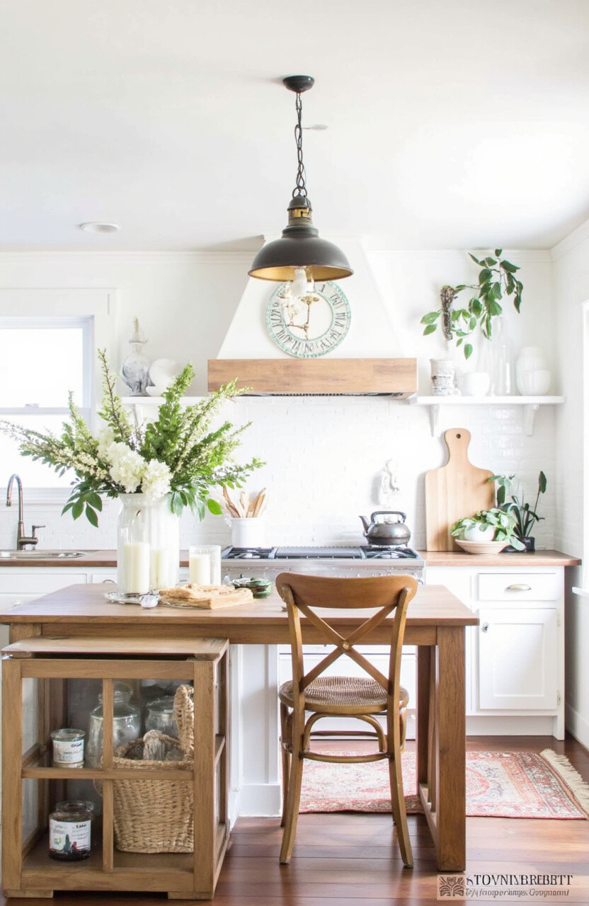 Industrial elements like metal stools or pipe shelving add an edgy look. They contrast beautifully with the farmhouse style.