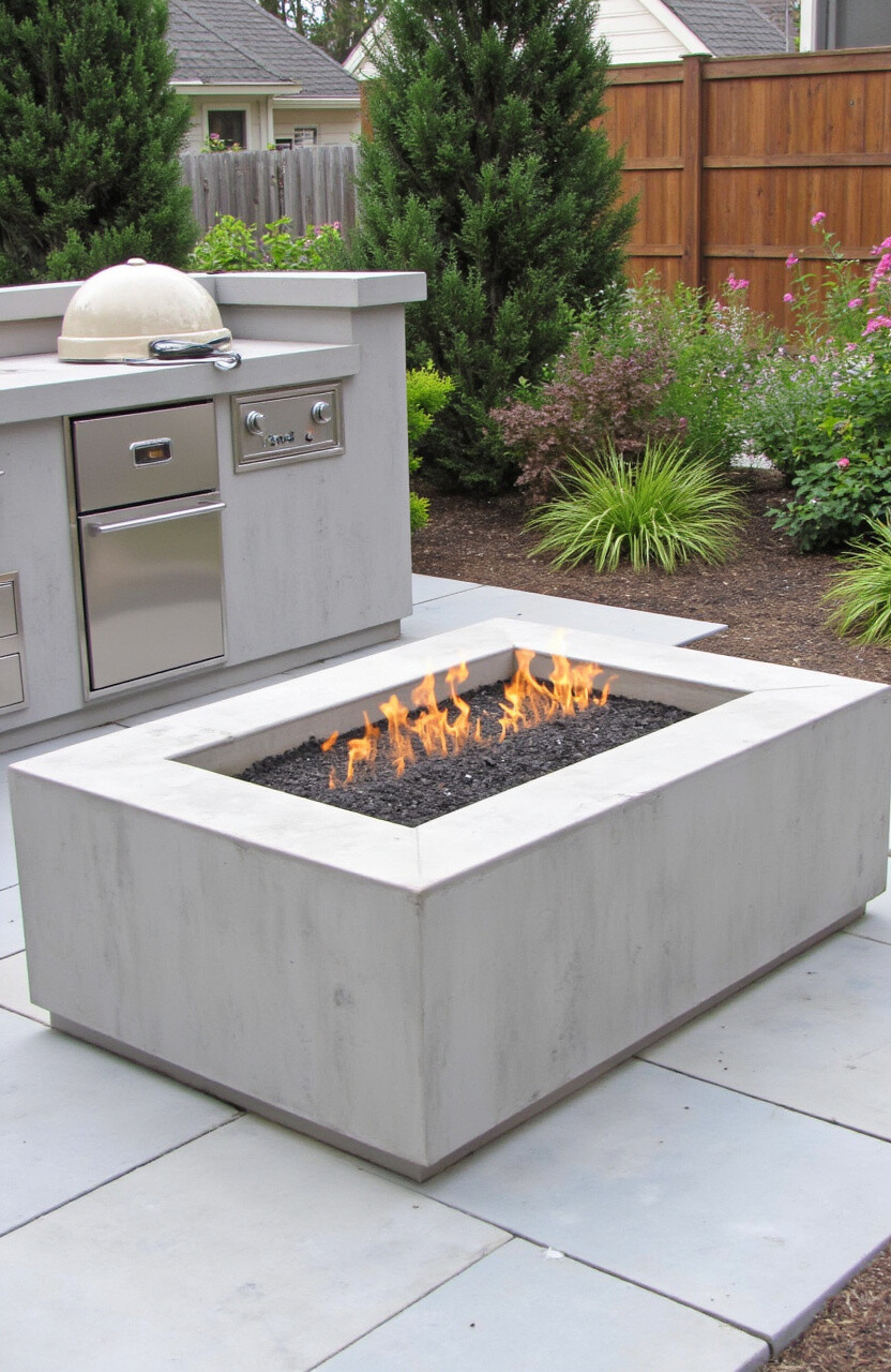 If you want something sleek and modern, a rectangular concrete firepit might be your style. It offers clean lines and a minimalist design that can complement any outdoor kitchen. Concrete is a great material because it’s sturdy and low-maintenance.
