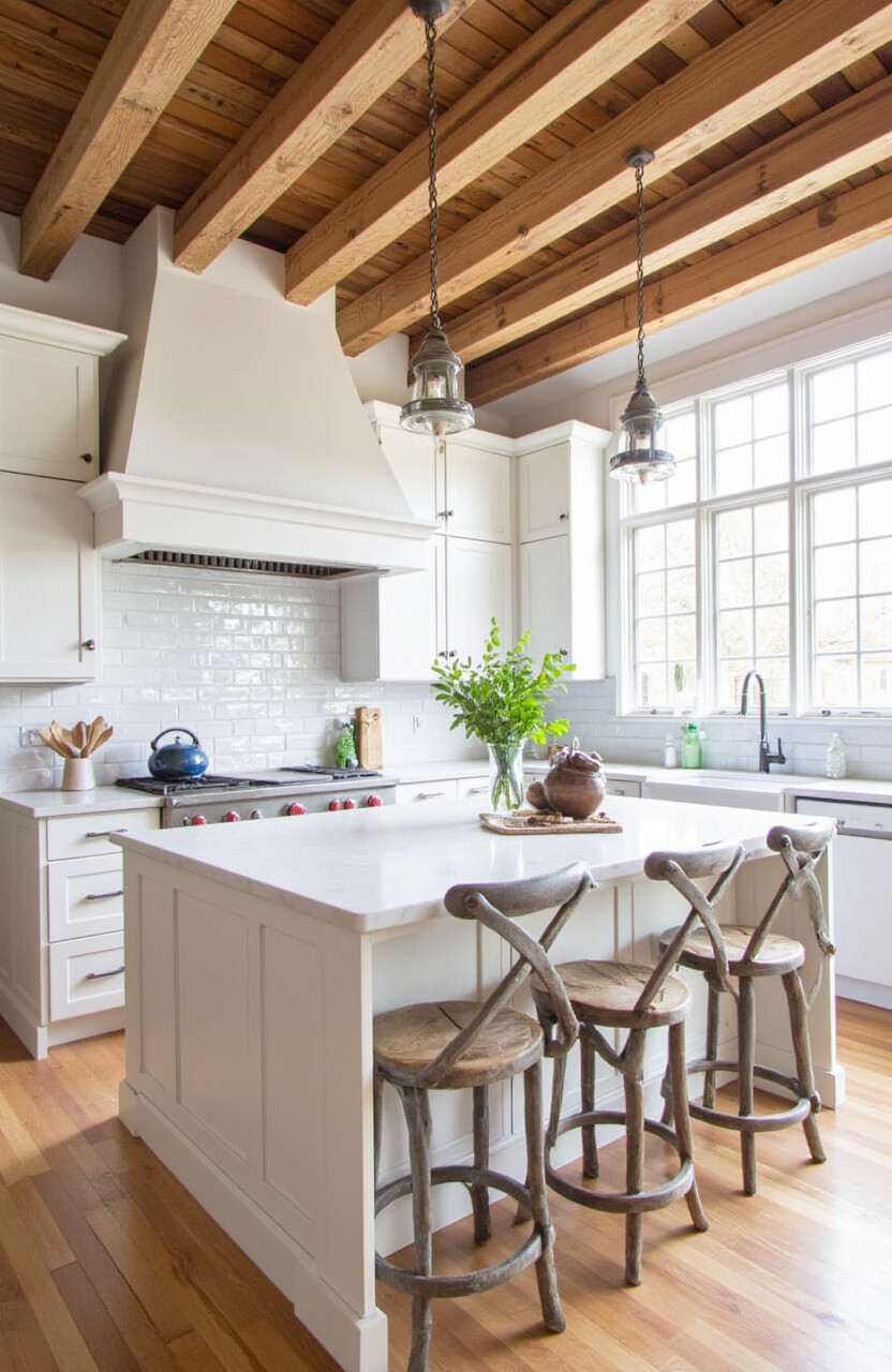 These beams can be left in their natural state for a raw look or stained to match your kitchen’s color scheme. They are perfect for high ceilings, adding depth and character.