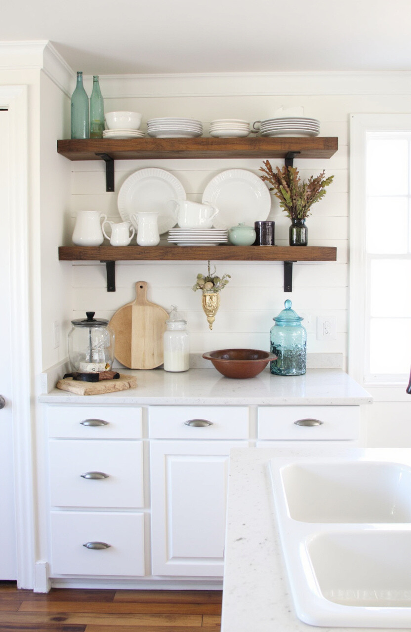 Open shelving gives your kitchen a light, airy feel while showcasing your favorite dishes. When you add rustic touches, like wooden shelves or metal brackets, it creates a beautiful contrast with modern kitchen elements.