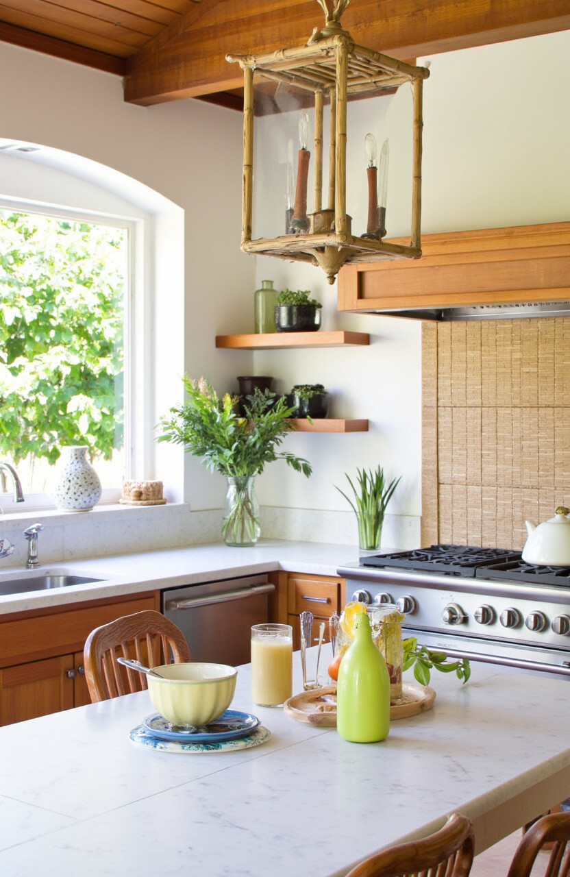 Consider bamboo for light fixtures, utensil holders, or even as a backsplash. Its natural color adds warmth to the space.