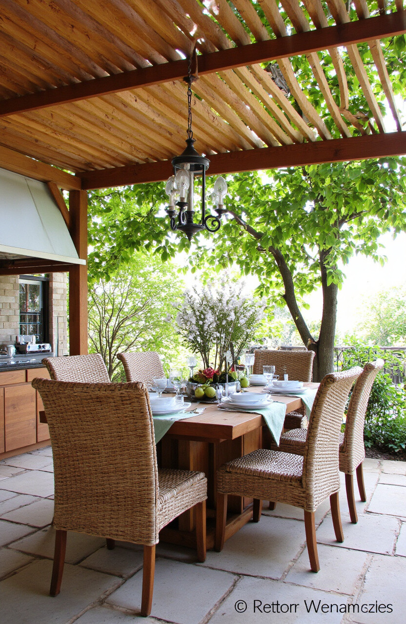 Wicker furniture brings a cozy, inviting vibe to outdoor kitchens. It’s light, airy, and perfect for a natural setting.