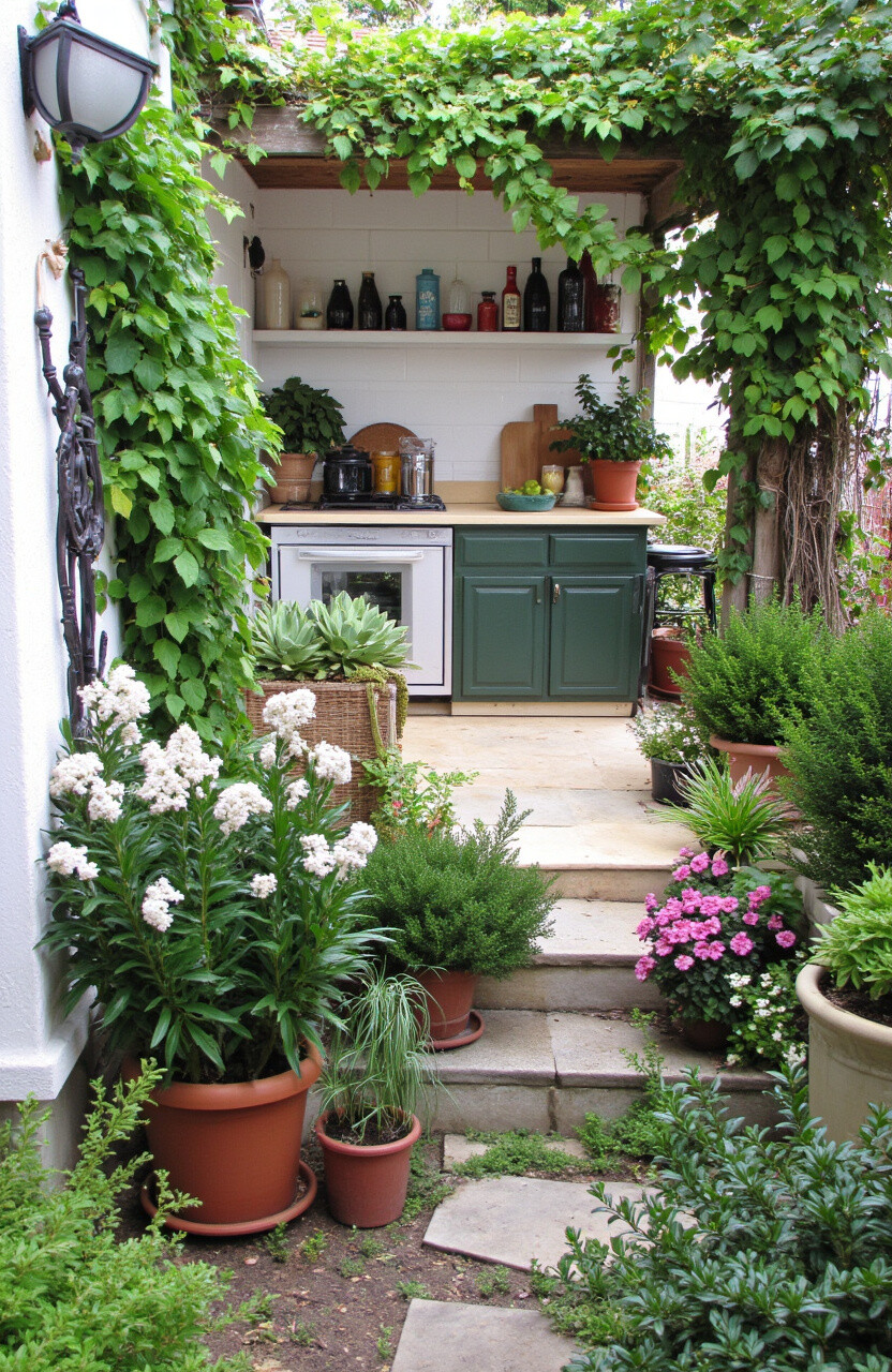 The beauty of this style is its simplicity and low cost. Start by placing potted plants around your kitchen area. It’s an easy way to bring life and color to your patio.