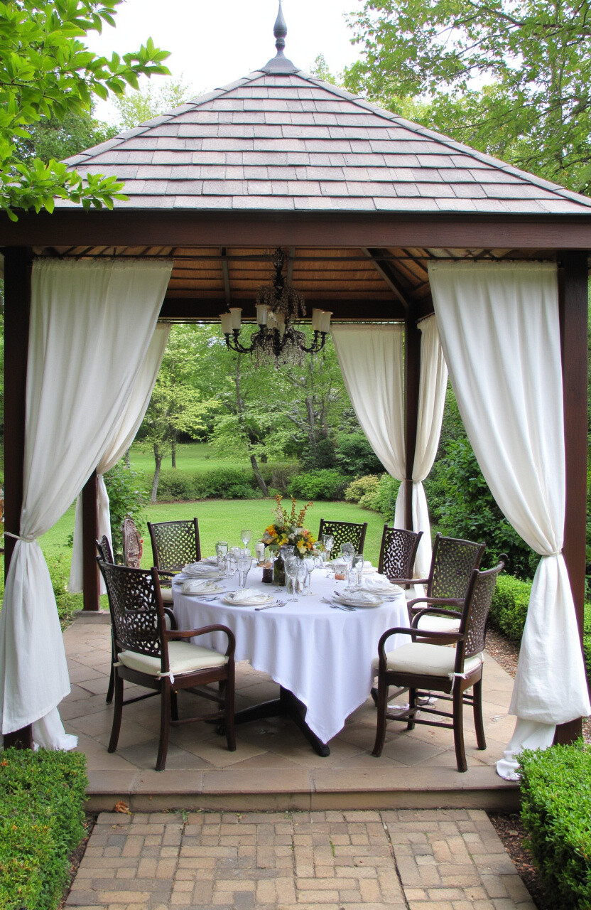 A gazebo provides a structured yet open-air dining experience. Decorate with sheer curtains and a chandelier for an elegant touch. The gazebo protects against the elements, making it perfect for any weather.