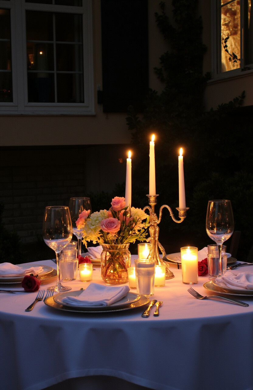Set the stage for a romantic evening with candles and soft lighting. Use a small table with elegant tableware and fresh flowers for a touch of sophistication. The gentle glow of candles creates an intimate atmosphere.