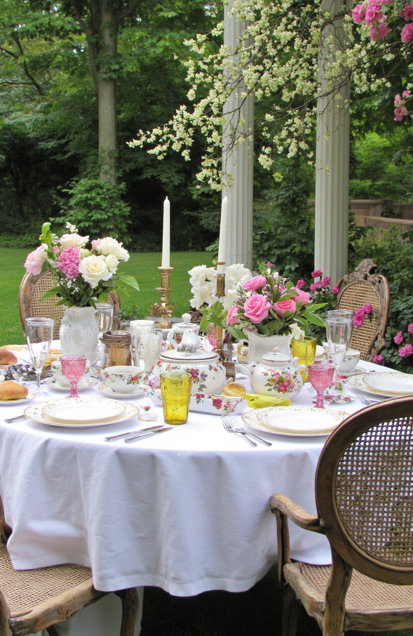 Create an elegant tea party setting with an English garden vibe. Use fine china, floral patterns, and wrought iron furniture. Roses and peonies are perfect flowers to enhance the theme.