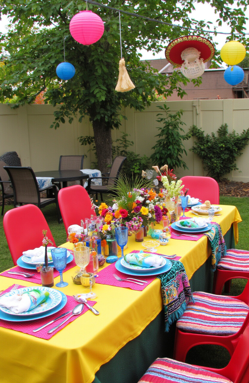 Infuse your dining area with vibrant colors and festive decor. Use bright tablecloths, string lights, and paper lanterns for a lively atmosphere. Maracas and sombreros add a playful touch.