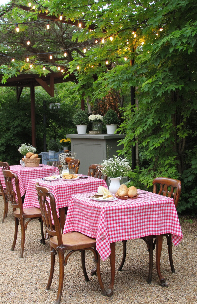 Create a cozy, Parisian bistro experience with small tables and classic bistro chairs. Use red and white checkered tablecloths and string lights for ambiance. Fresh baguettes and cheese platters complete the theme.